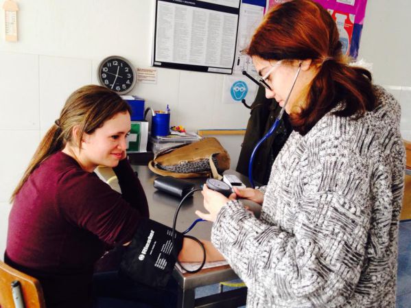 Algunos alumnos de Tercer año de bachillerato que cursan Ciencias Biológicas (Medicina), practican en clase los conocimientos aprendidos sobre presión arterial y glicemia con alumnos y profesores.